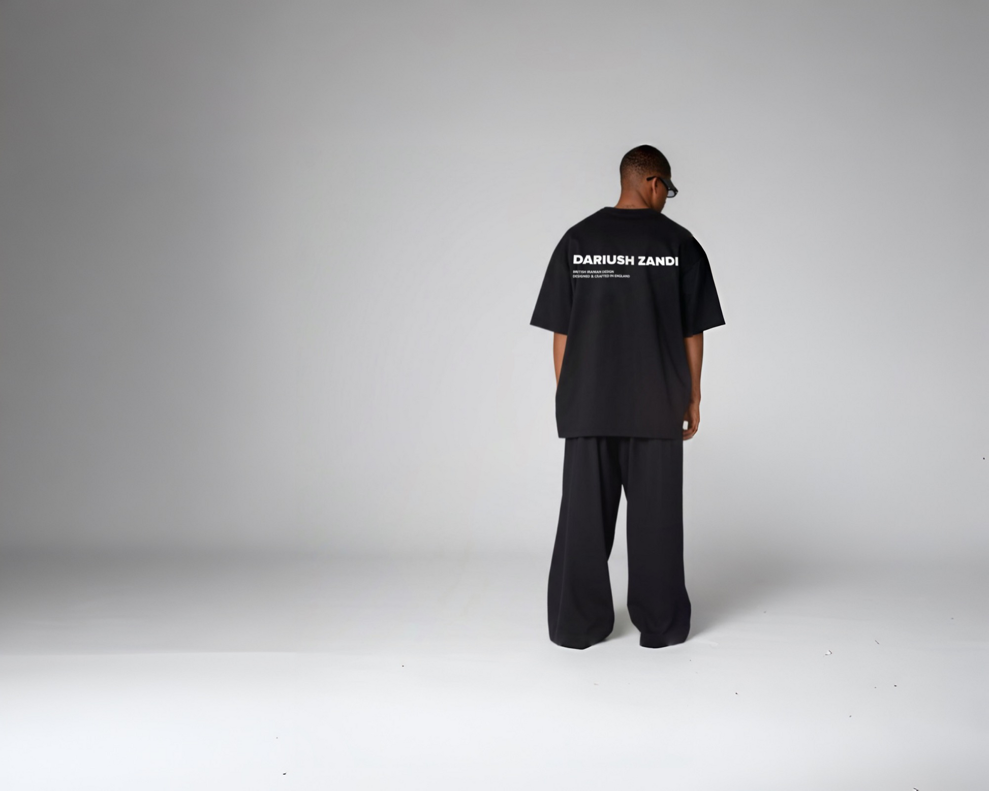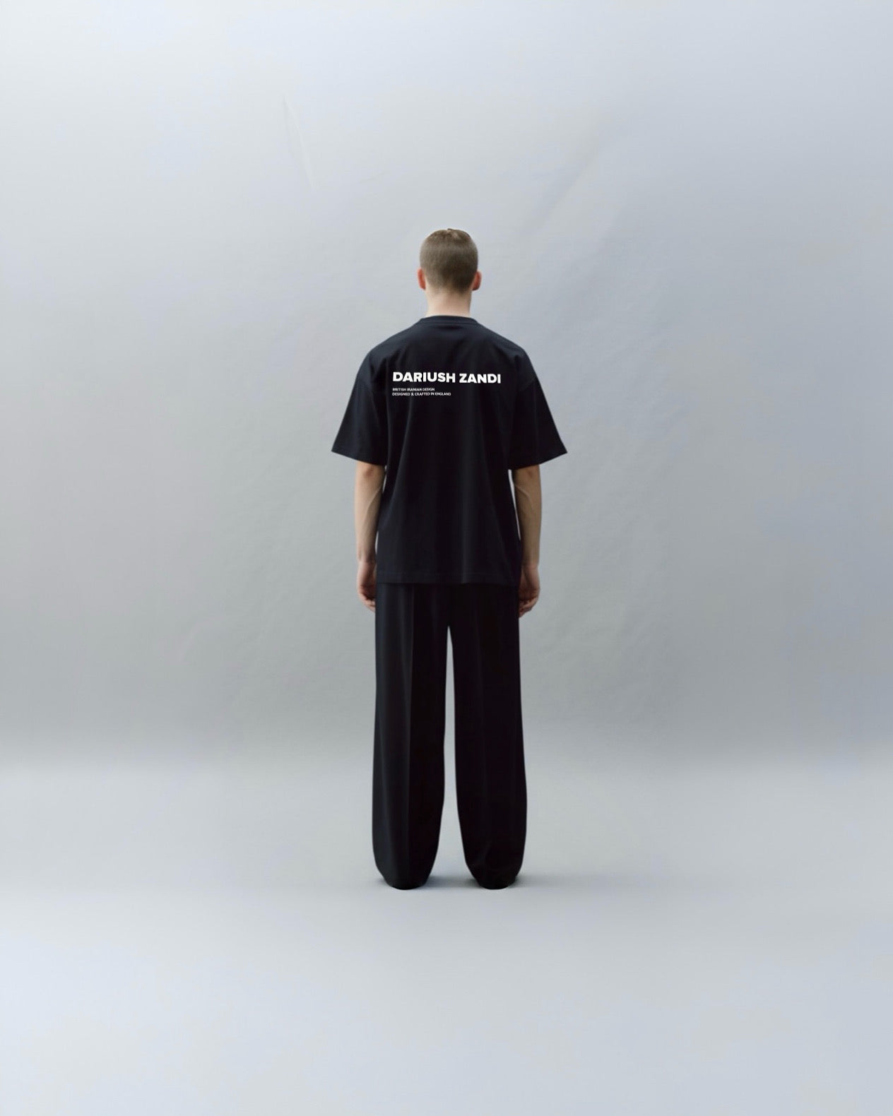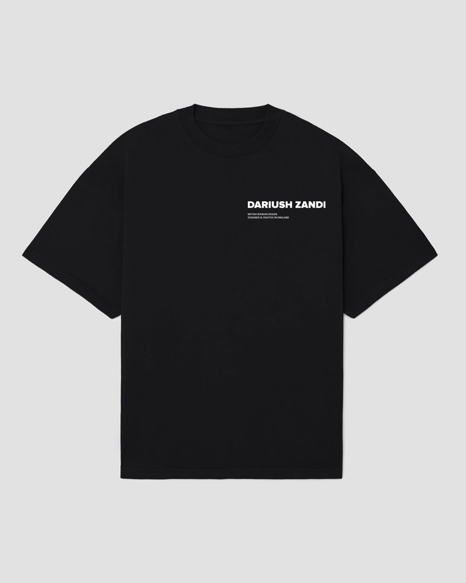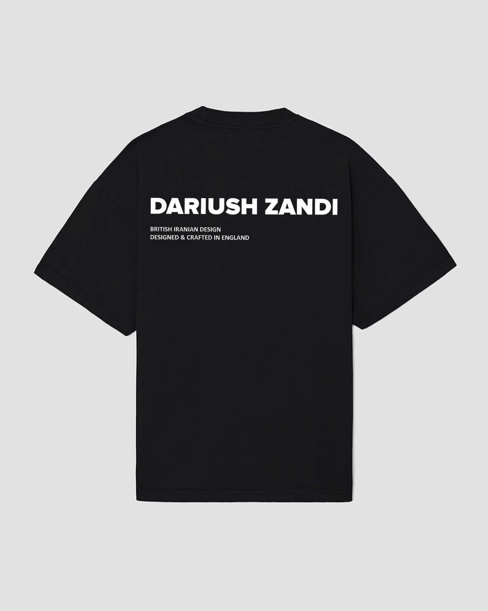 Constructed in structured heavyweight cotton and cut to an oversized fit, it features the signature DARIUSH ZANDI logo paired with a double-line declaration: British Iranian Design and Designed & Crafted in England.