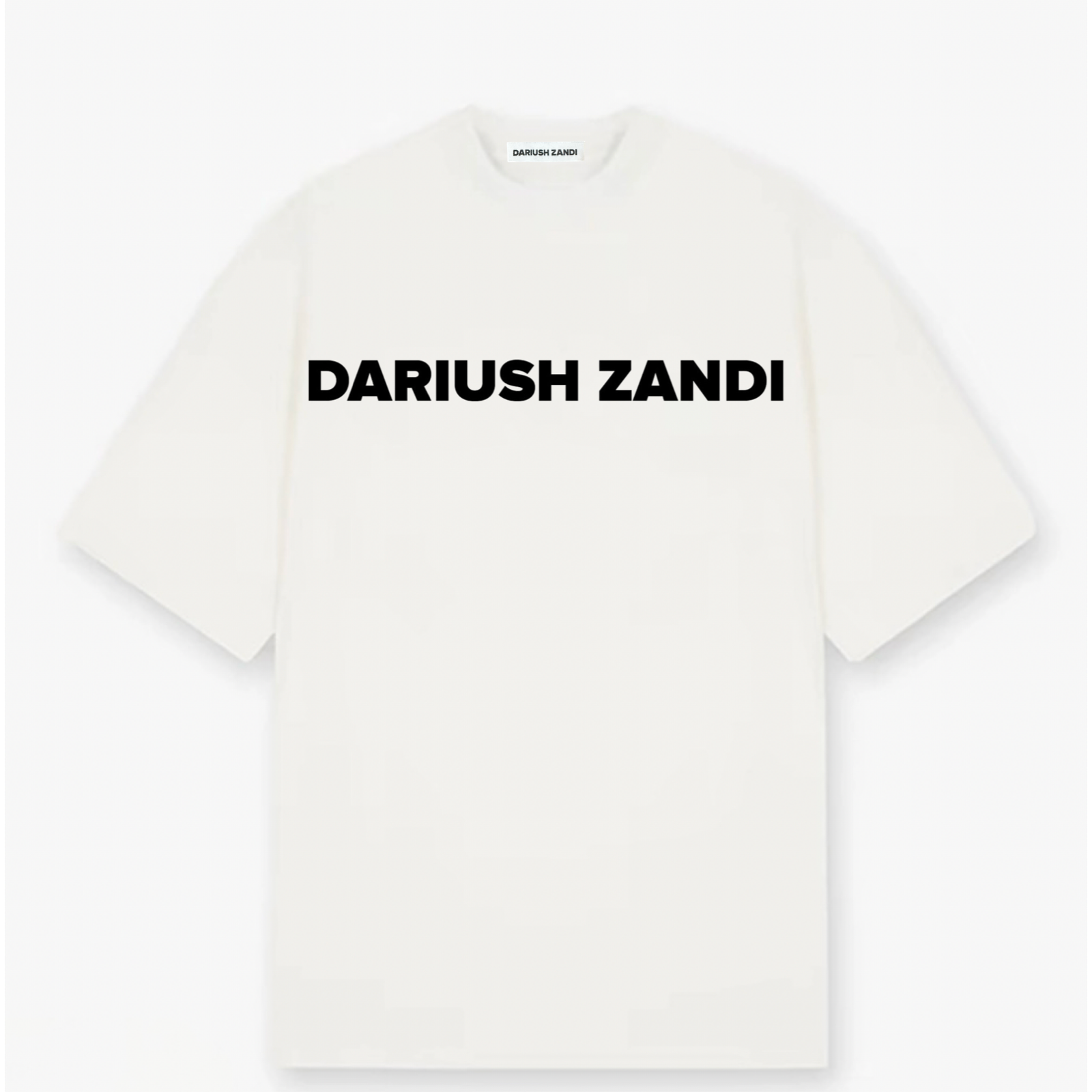 Cut from heavyweight cotton in a structured, oversized silhouette, it features the bold DARIUSH ZANDI logo across the chest and a subtle branded patch at the hem.